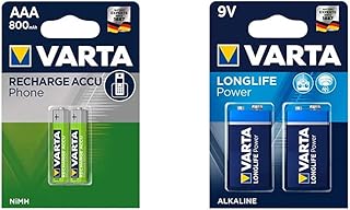Varta Micro AAA Akku für DECT-Telefone 800mAh 2er Blister, 1,2V, NiMH & Longlife Power 9V Block 6LR61 Batterie (2er Pack) Alkaline E-Block Batterien -ideal für Feuermelder Rauchmelder Stimmgerät
